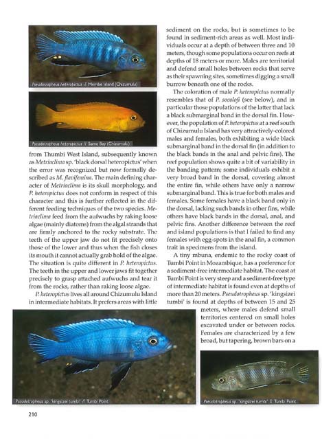 有趣的是,目前被认为是不同物种的 P. socolofi 类慈鲷 P. sp. 'socolofi nkolongwe'(在第 284 页讨论)在 N'kolongwe 的不同栖息地(非常浅的水域)中发现,它是一个在外观上无法与 P. socolofi 区分的物种,那里也是 Metriaclima aurora 的家园。P. socolofi 和 M. aurora 在 Mala Point 和 Tumbi Point 一起出现,但都没有出现在 Tumbi 和 N'kolongwe 之间的区域。