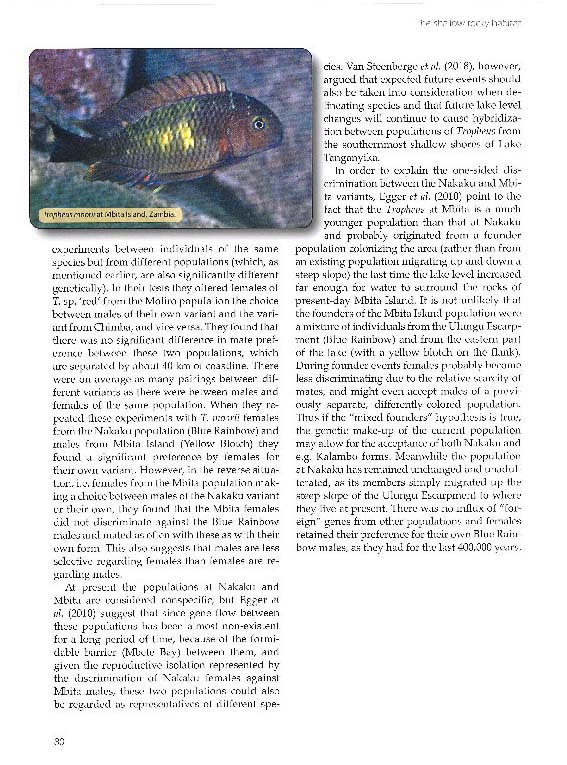 2010 年,Egger 和他的同事们完善了这些繁殖实验,并包括了来自不同种群(如前所述,这些种群在遗传上也显著不同)的个体间的配偶选择实验。测试中,他们给 Moliro 种群的 T. sp. 'red'雌鱼提供了自己变种的雄鱼和 Chimba 变种雄鱼的选择,反之亦然。他们发现,这两个种群之间的配偶选择没有显著差异,这两个种群之间的湖岸线约 40 公里。当他们对来自 Nakaku 种群(蓝彩虹 Blue Rainbow)的 T. moorii 雌鱼和 Mbita 岛(黄斑 Yellow Blotch)的雄鱼重复这些实验时,他们发现雌鱼对自己变种的偏好显著。然而,在反向情况中,即 Mbita 种群的雌鱼在选择 Nakaku 变种雄鱼或自己的变种雄鱼时,发现 Mbita 雌鱼对蓝彩虹 Blue Rainbow 雄鱼没有歧视,选择频率与自己的变种雄鱼一样高。这也表明雌鱼在选择雄鱼方面要比雄鱼在选择雌鱼方面更加挑剔。